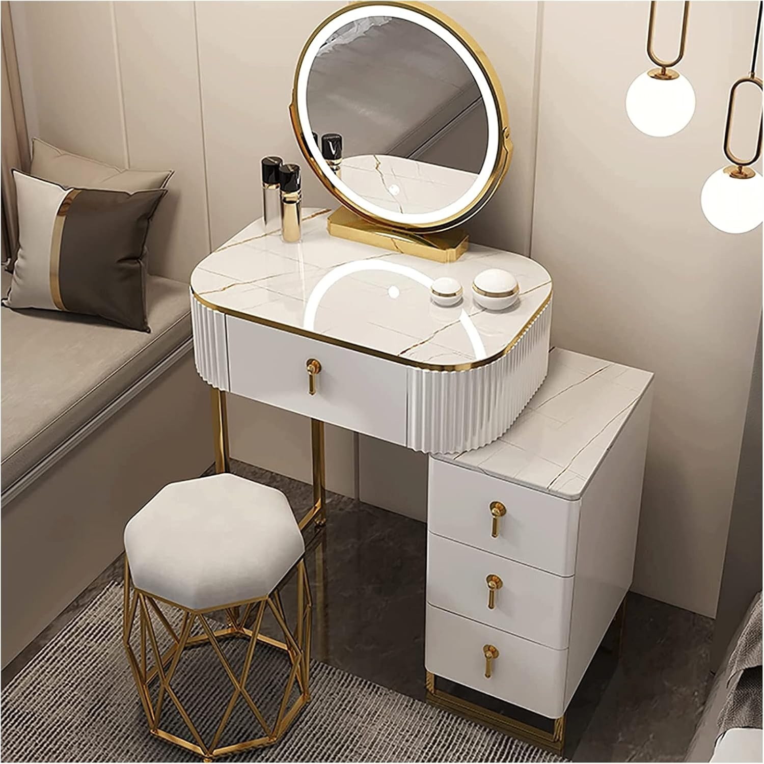 Premium Gold & White Vanity with Velvet Stool – Spacious Drawers, 3-Color Dimmable Light, Scratch-Resistant Marble Top